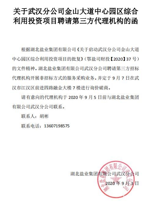 关于武汉分公司金山大道中心园区综合利用投资项目聘请第三方招标代理机构的函.pdf